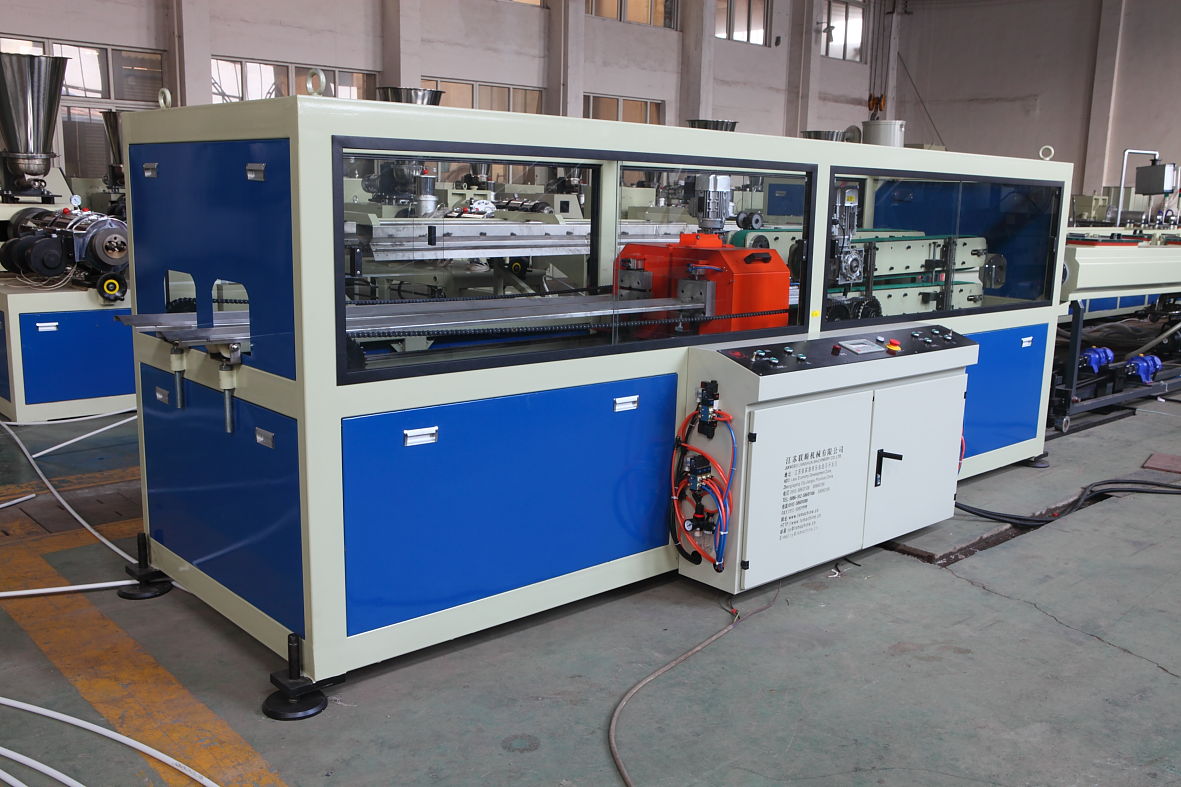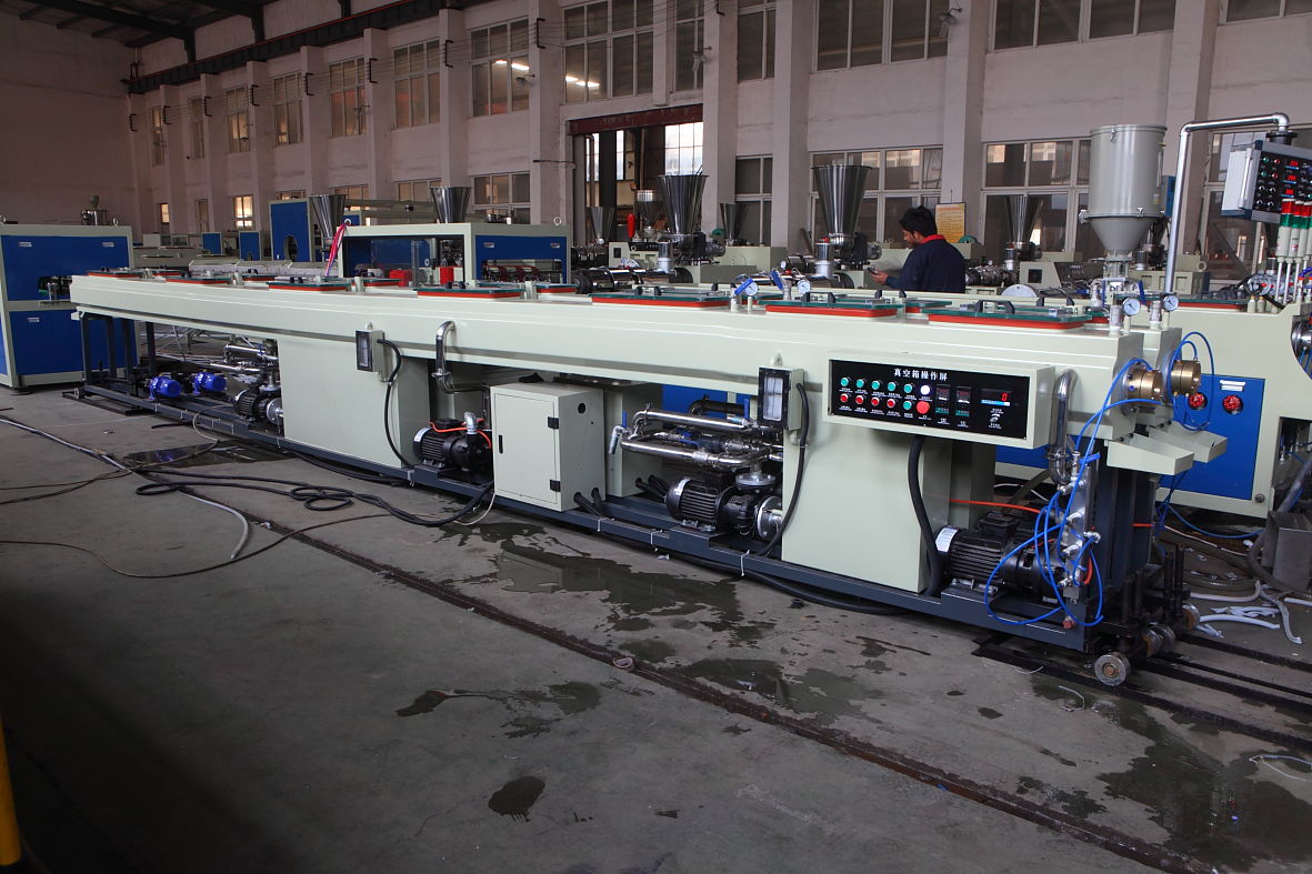 本生產(chǎn)線使用一出二排水模具,分體式一出二真空定型水箱,真空定型水箱采用全段式抽真空方式定型冷卻,每根管材都在分開的箱內(nèi)抽真空定型,牽引機(jī)采用膠塊式兩爪牽引機(jī),牽引速度可以調(diào)速控制,切割機(jī)采用鋸片切割機(jī),堆放架具有自動(dòng)卸料功能,不需要人工進(jìn)行操作。