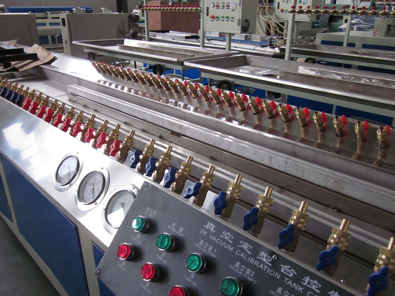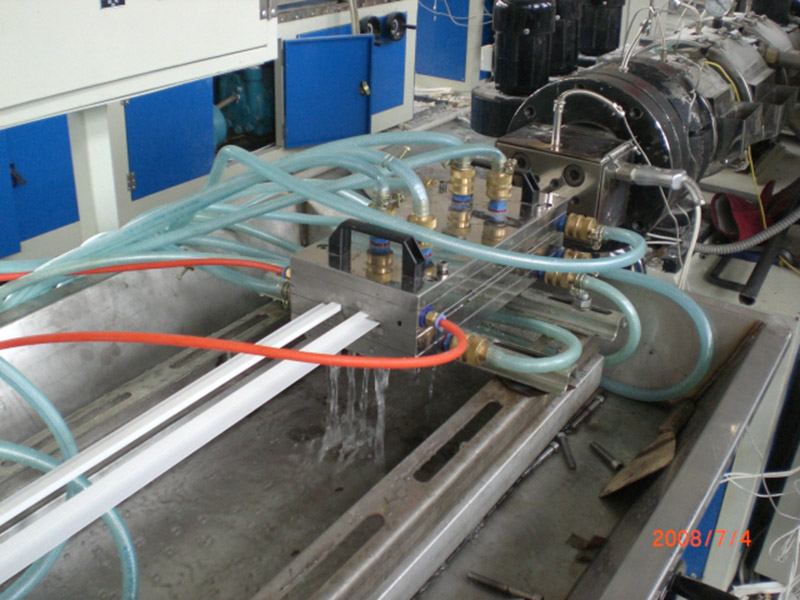 3,特殊亞軍結(jié)構(gòu)擠出模頭,高精度45#鋼真空定型模具,穩(wěn)定的真空度校準(zhǔn)表,勻速和高牽引力NBR履帶牽引機(jī)幫助制造PVC型材